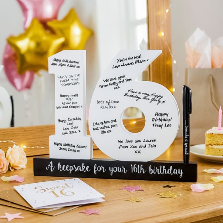 Celebrate the sweet 16 with this trendy 16th Birthday Signature Number! Use the bold, stylish numbers as a decoration and a guest book for this momentous birthday. Family and friends can use the marker pen to leave special messages and birthday wishes for the guest of honour. The white numbers stand high on a sleek black base that reads "Happy Birthday." After the party, the birthday person can showcase the numbers in their home, treasuring the special birthday messages for years to come. A great gift for anyone who's turning 16!