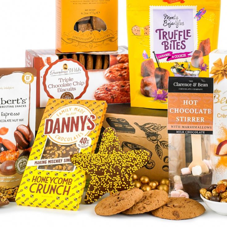 Pure bliss comes in this chocolate lover's Chocolicious Hamper. This delectable gift box is heaven for those that have a sweet tooth. Triple chocolate chip biscuits, caramel and cookie truffles, fudge, chocolate bars, Belgian creme brulees, chocolate stars, and even a hot chocolate stirrer with marshmallows fill this delicious basket. Add in a bag of coffee and chocolate nut mix for just a hint of salt to break up the sweetness and this hamper becomes a blend of joy.