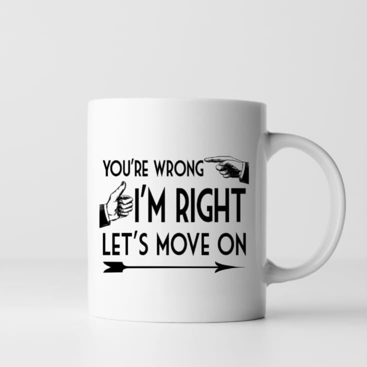 This fun mug by Find Me A Gift is the perfect Birthday present for over confident know-it-alls...and your good self of course! With 'YOU'RE WRONG I'M RIGHT LET'S MOVE ON' and a dash of vintage whimsical styling, our funny coffee mugs are perfect for work or home. Whether you are looking for Secret Santa gifts or funny presents for mum, the You're Wrong I'm Right Mug is ideal. Each mug is made to order and features the same artwork front and back, so that everyone can appreciate your great taste and wit.