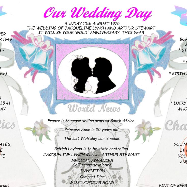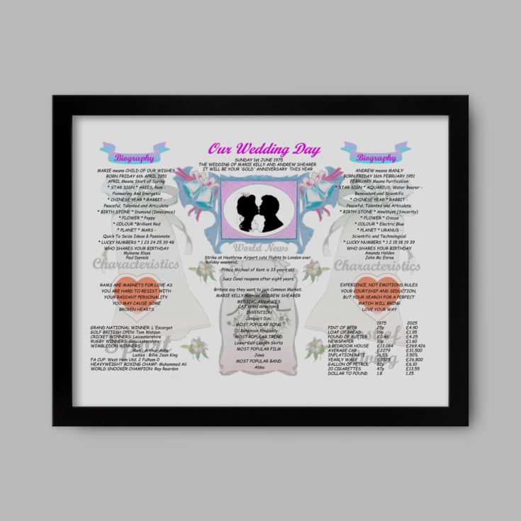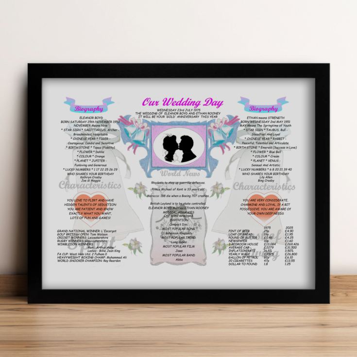 Celebrate five incredible decades of love with our 50th Anniversary Wedding Chart. More than just a gift, it’s a heartfelt time capsule that honours the moment two lives became one and the beautiful journey since.