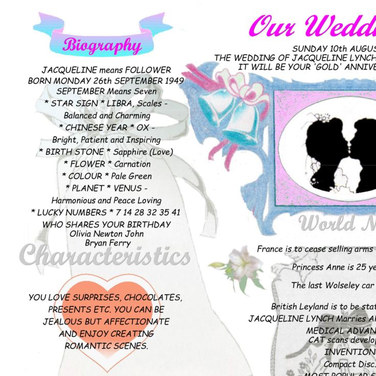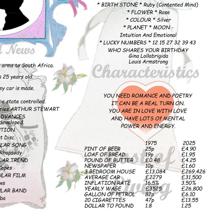 Inside this unique design lies a story frozen in time: details from the couple’s birth dates, their star signs and birth flowers, and a rich snapshot of the world on the day they were married. It features memorable headlines, popular culture from the era, and the going prices of everyday items like milk, bread, and beer. You’ll also find the number-one song and film, award-winning cinema moments, and global population stats – all woven into a beautiful display that brings the past to life.