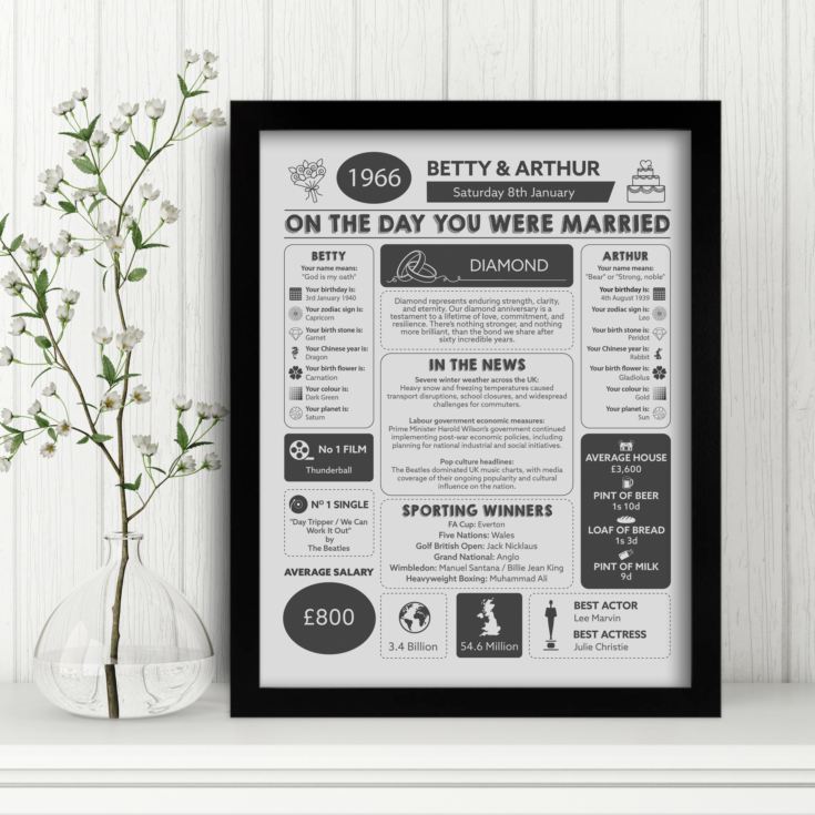 Celebrate an extraordinary 60 years of marriage with our 60th Anniversary Wedding Chart - a beautifully personalised tribute to a love that has stood the test of time. This one-of-a-kind gift captures the magic of the couple’s wedding day and brings it to life with nostalgic detail.