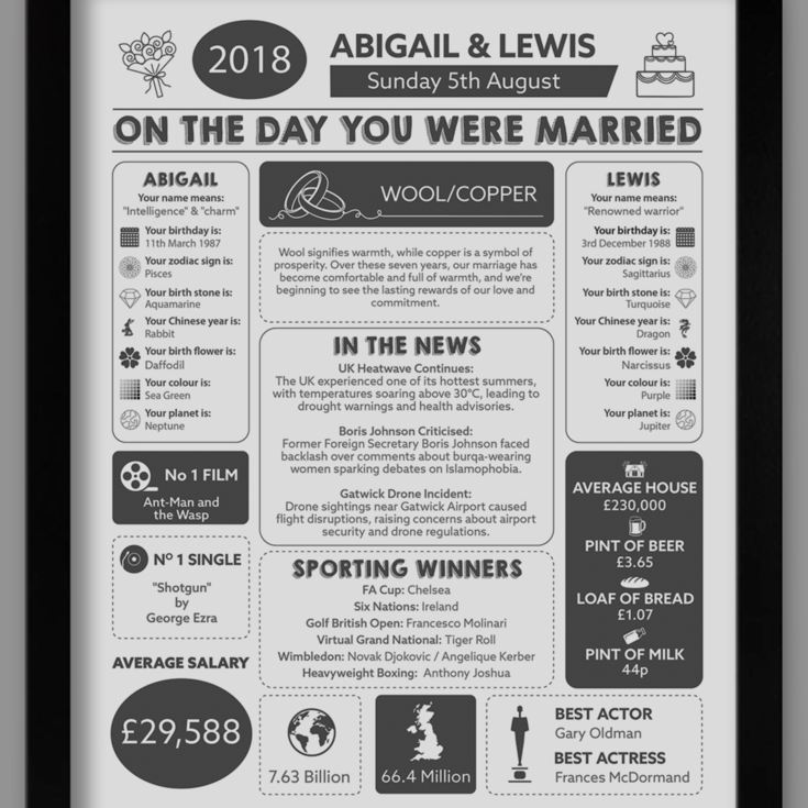 Seven years of marriage is a beautiful testament to lasting love, resilience, and shared memories. Mark this special milestone - traditionally celebrated with copper - with a personalised framed print that captures the essence of the day it all began.