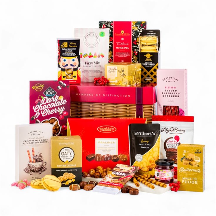 Bursting with festive flavours and handpicked treats, this luxury Christmas hamper is a joyful crowd-pleaser. From crumbly fudge and gooey caramel chocolate to savoury flatbread crackers and buttery mince pies, there’s something to tickle every taste bud.