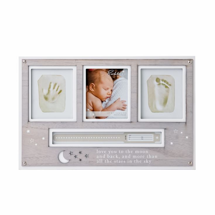 This wall-hanging frame features a sleek matt white finish with a grey washed-wood mount, adorned with silver stars and the heartfelt ‘Love You to the Moon and Back’ sentiment. It has dedicated space for a hospital bracelet, a treasured baby photo, and clay imprints of both hand and foot using the included kit.