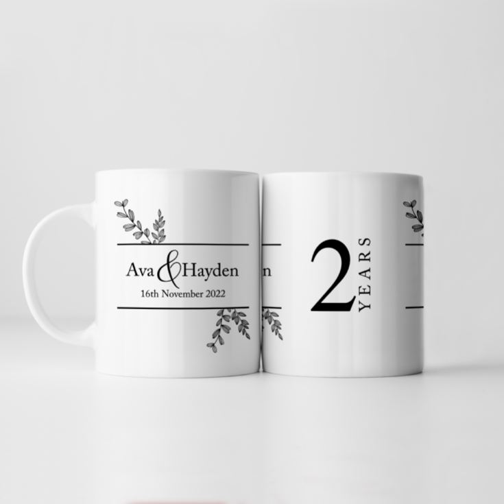 The side of the mug (opposite the handle) features fixed text "2 YEARS", just in case they forget how long it's been since you both said, "I Do".