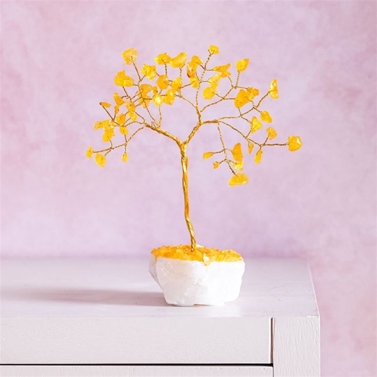Brighten up your home with the Serenity Citrine Gemstone Tree, a miniature masterpiece that radiates warmth, positivity, and vitality. Its twined gold metal trunk and branches support 60 genuine yellow citrine crystals, celebrated for their uplifting energy and joyful vibes.