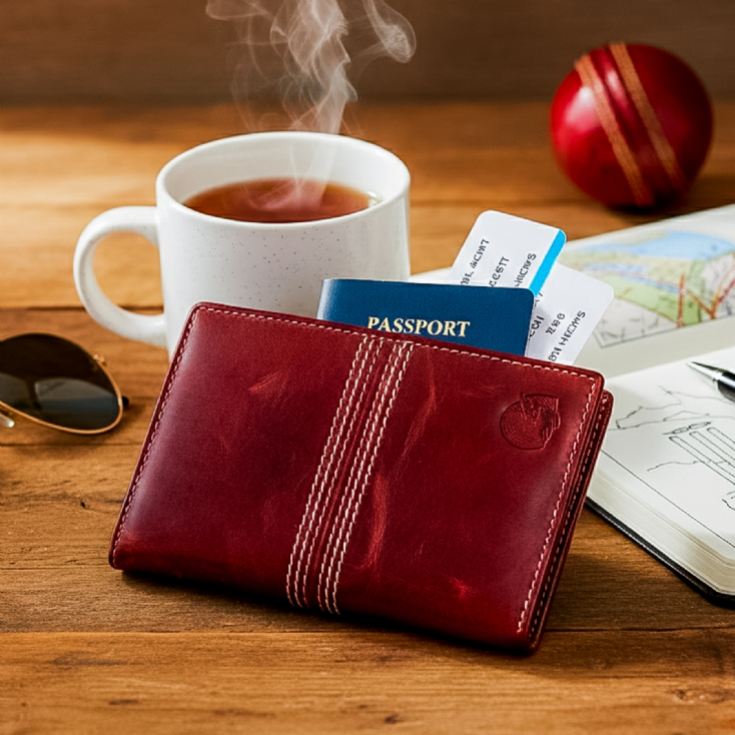Featuring a rich red leather exterior with cricket-inspired stitching, it offers five card slots, a zipped area for mobile or cash, and an ID pouch to keep everything in its place. Its tactile finish and multicoloured accents make it ideal for travel, everyday errands or match-day must-haves.