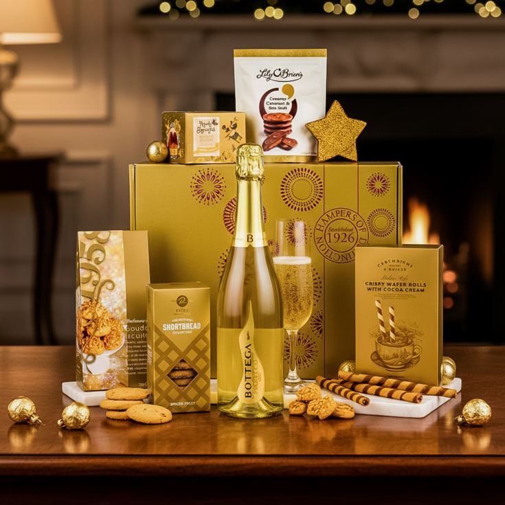 This luxurious prosecco and treats hamper is pure elegance in a box, fizz, truffles and more, all wrapped in golden glory.