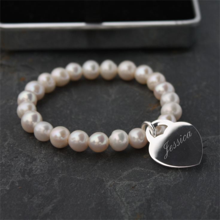The bracelet is made from Fresh Water Pearls and has a heart pendant which is engraved with a name or short message of your choice.
