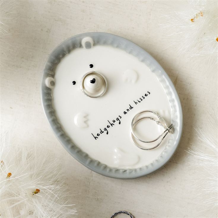 Keep your rings safe in the cutest way possible with the Send With Love Hedgehog Ring Dish. This delightful ceramic dish features a hedgehog on its back, with its little nose acting as the perfect ring holder and the charming phrase “hedgehugs and kisses” printed on its belly.