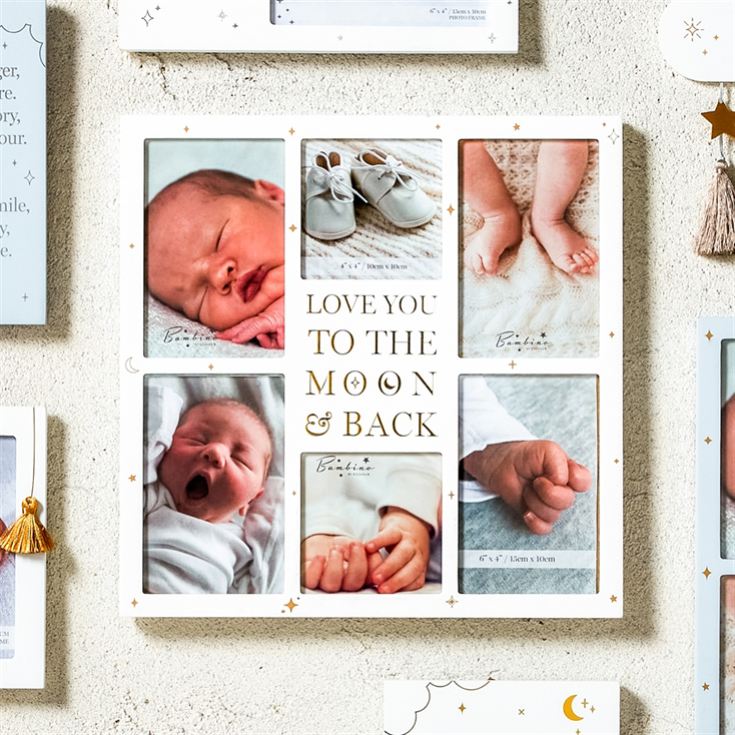With its soft matt grey finish, shimmering gold detailing, and the tender “Love You to the Moon & Back” sentiment, this frame isn’t just décor – it’s a memory capsule. Featuring six apertures (four portrait and two square), it’s perfect for creating a beautiful collage of baby milestones, family smiles, or treasured snapshots.