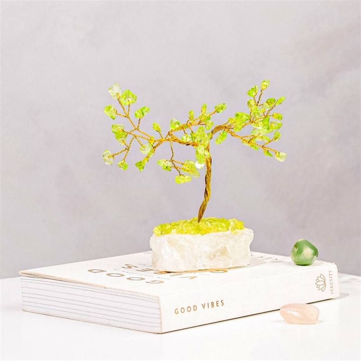 Infuse your home with vibrant energy and positivity with the Serenity Peridot Gemstone Tree. This miniature marvel features a twined gold metal trunk and branches, adorned with 60 genuine green peridot crystals, known for promoting vitality, growth, and positive vibes.