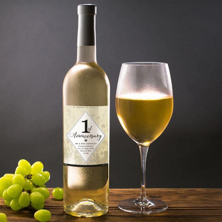 Mark a wonderful couple’s first wedding anniversary with this beautiful bottle of white wine, complete with a custom label of your choice.