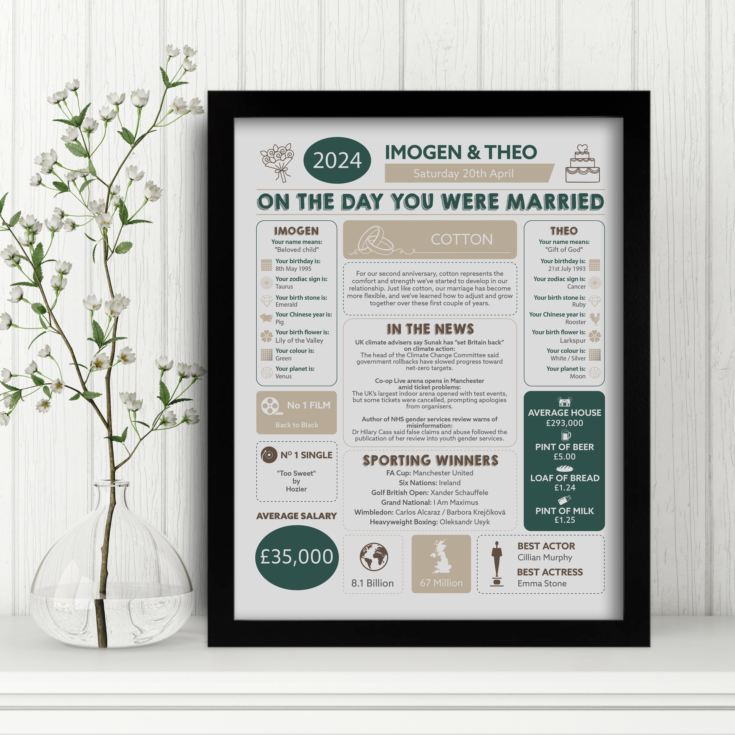 Celebrate two wonderful years with our 2nd Anniversary Wedding Chart framed poster.Mark a meaningful milestone with this beautifully designed keepsake, created to commemorate the day the couple said "I do." Ideal for a second anniversary - traditionally the cotton anniversary - this personalised print makes a heartfelt and nostalgic gift.