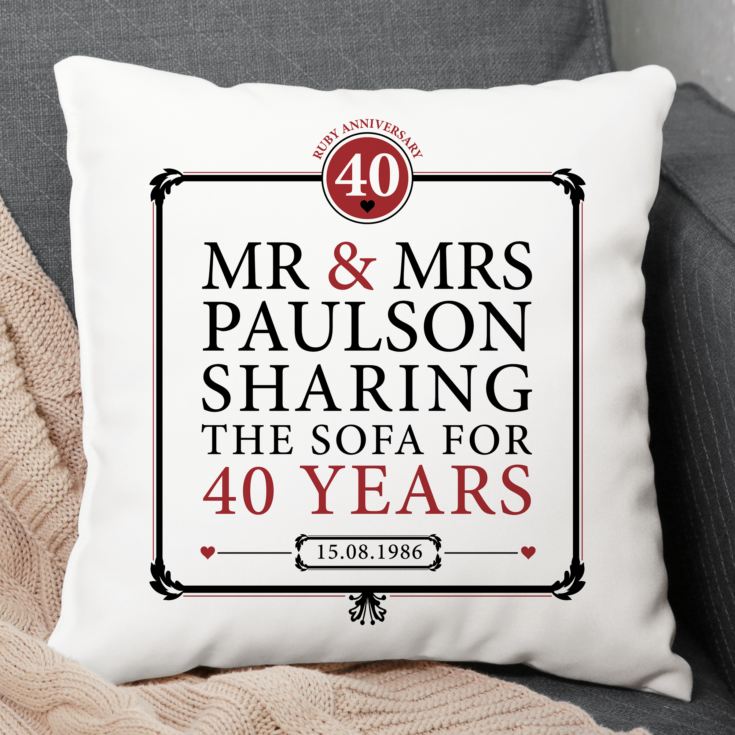 Celebrate 40 years of love with our Personalised 40th (Ruby) Anniversary Sharing the Sofa Cushion.
