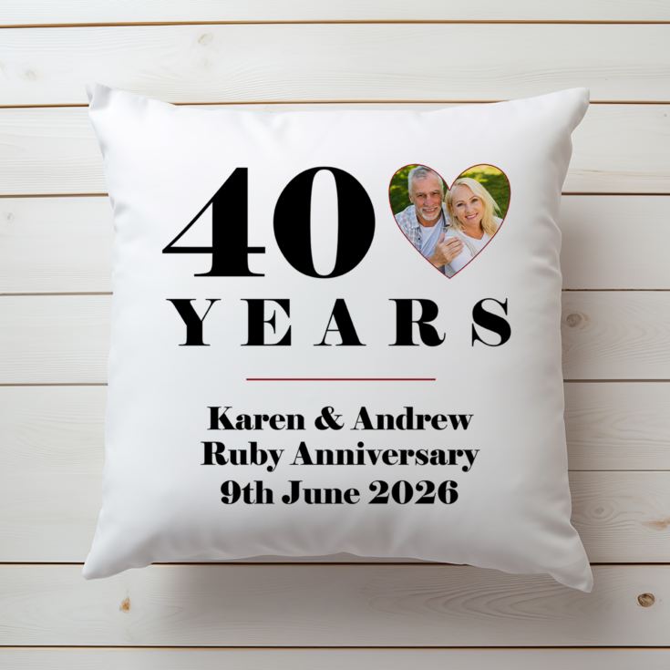 Celebrate 40 years of marriage with this beautiful Personalised 40th Wedding Anniversary Photo Cushion. Add any photo to this lovely gift to make a truly personal present for a special couple. The photo could be of them now or even a photo from their actual wedding day, 40 years earlier. The image will be printed inside the heart to the right of the big 40 displayed on the cushion.