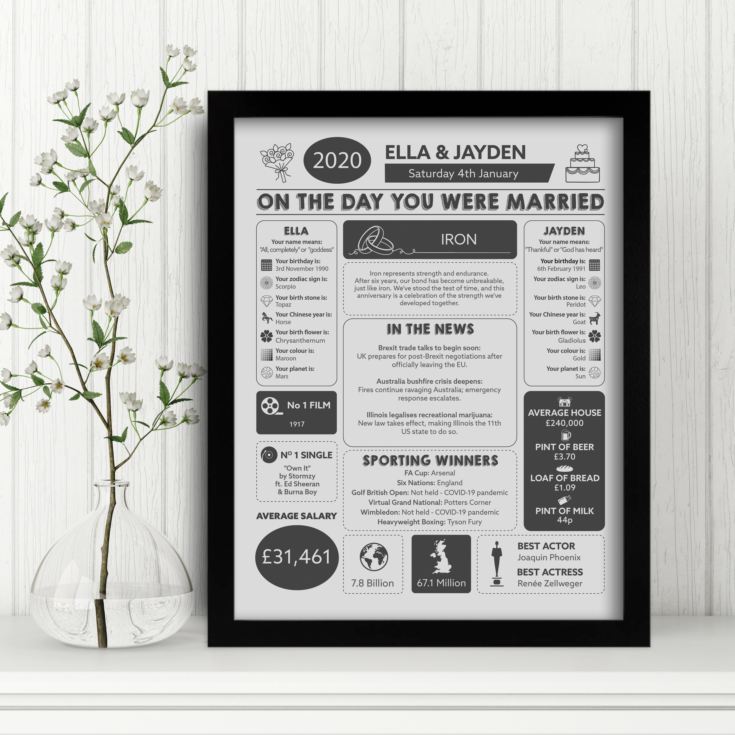 Thoughtfully designed, the print features a blend of personal and historical details. You'll find the couple’s birth flowers and zodiac signs, as well as a snapshot of what the world looked like on their wedding day - headlines from the news, popular songs and films, Oscar winners, and the cost of everyday items like milk, bread, and beer. It also includes UK and global population figures for a nostalgic and engaging touch.