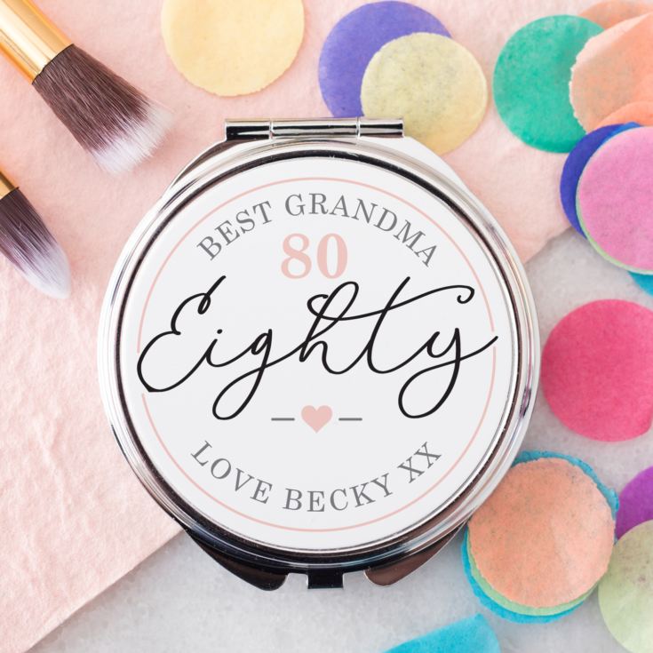 Celebrate turning 80 with this beautiful personalised compact mirror. The compact features a 80th birthday design which is personalised with two lines of text and the number 80. The space for text is above and below the age and perfect for the recipients name and a short message.