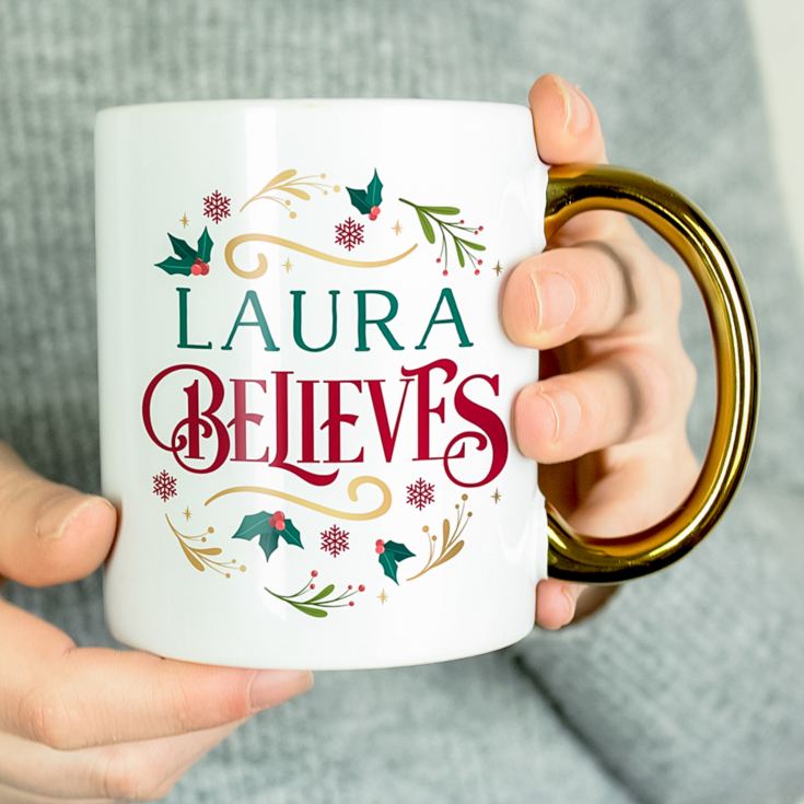 Celebrate the magic of Christmas with our Personalised "Believes In Christmas" Gold Handled Mug.