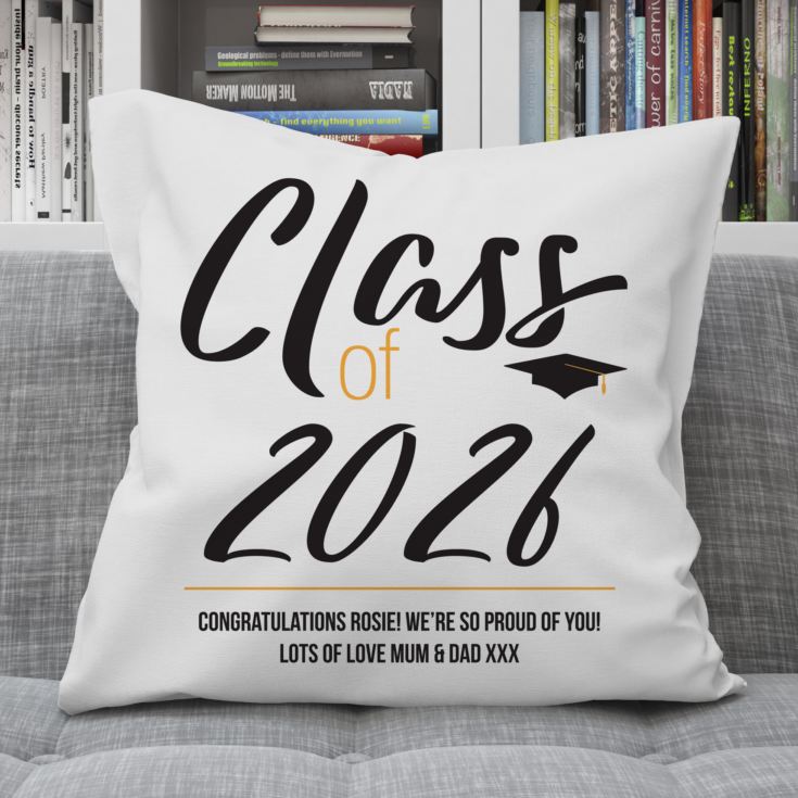 The cushion features the words 'Class of Year' in large black & yellow letters and can be personalised just underneath with a 2 lined message of your choice.
