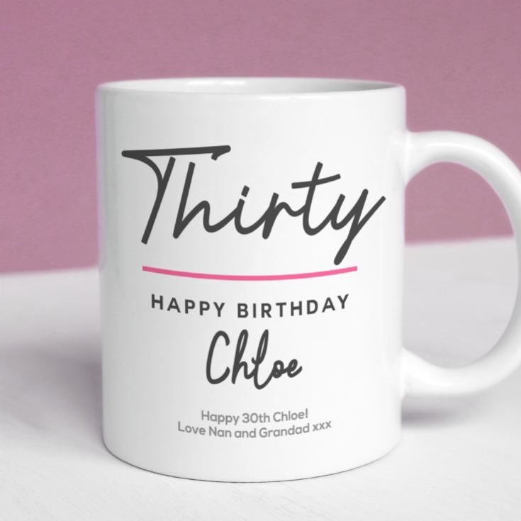 Personalise with a name which will appear in the same script font as the number "Thirty" alongside a birthday message which completes the design in a standard font. Whether you want to send well wishes for the new decade or take a mini trip down memory lane with a short but sweet tale of their past, your words will make the birthday celebrant grab this mug every morning, ready for a classy cuppa.