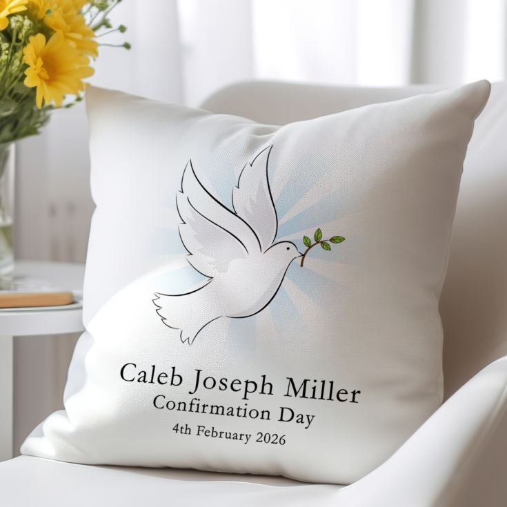 Featuring a white dove holding a branch in the centre, the personalised confirmation day cushion makes a perfectly unique gift for this traditional ceremony.