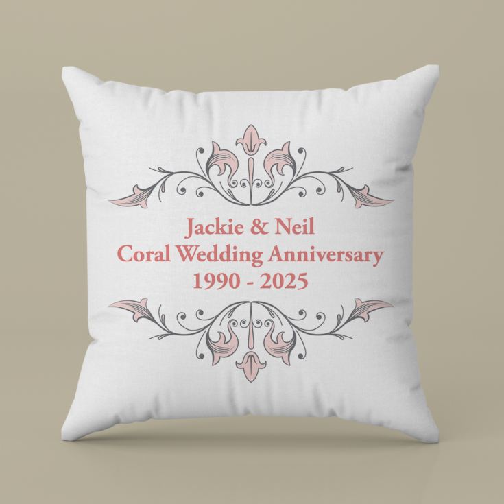 Celebrate a 35 years of marriage with this stunning Personalised Coral Anniversary Cushion displaying the names and wedding date of the happy couple. The cushion will look great displayed on your favourite chair or perfect for a cuddle on the sofa. It is a lovely keepsake and a special gift to remind the recipients of their wedding day thirty five years ago.