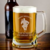 The glass tankard has a heavy base, and straight sides, with a good sized smooth handle. The design is etched clearly into the glass, and depicts a football player with a ball, while above the image arches your chosen name, and below is a short message over two lines of text.