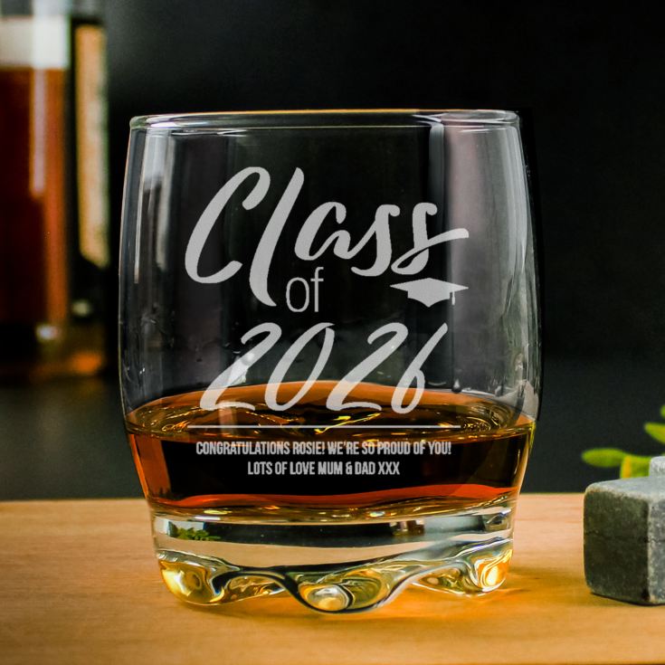 The whisky tumbler reads "Class of *Year*" so that the student will always remember the best class, and then underneath this you can add your own personal message which we will engrave onto the glass.