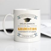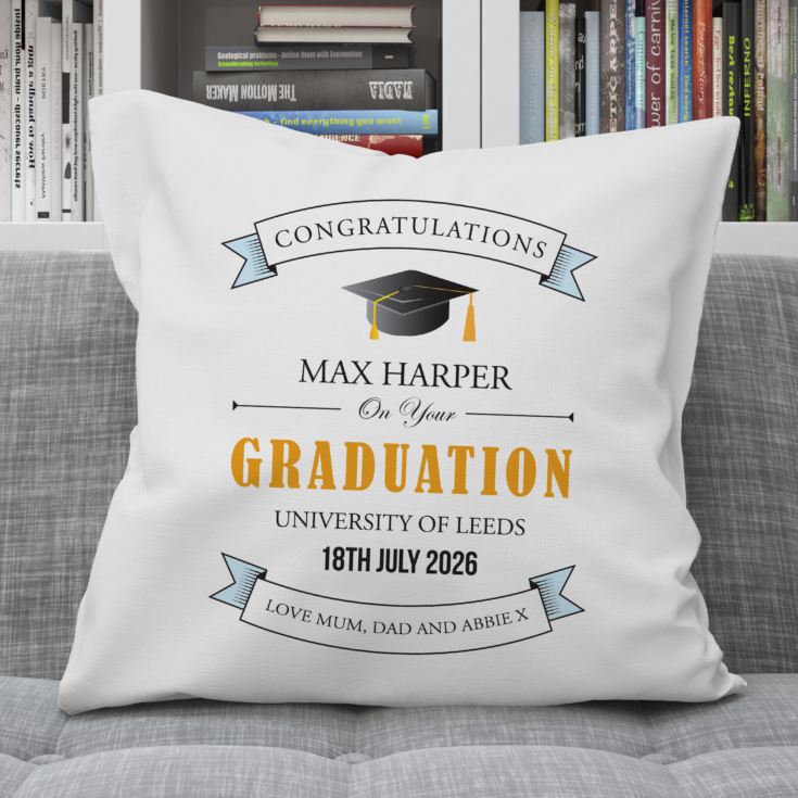 Printed on the cushion are the Graduation details including Name, Date of Graduation, University name and who the gift is from. The details are all presented around a beautiful design featuring a Graduation cap.