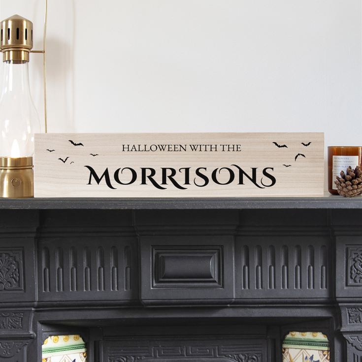 ‘Halloween with the’ comes as standard text, displayed in black block capital letters, ready for you to add the family name in order to create a unique touch. The mantle sign is decorated on either side with spooky black bats that add to the Halloween theme.