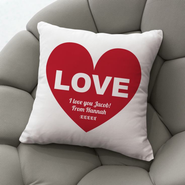 What better way to express how you feel than with this Personalised Love Cushion. The cushion has a giant red heart on the front with the word LOVE written in white inside the heart.