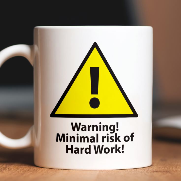 This striking mug features a yellow warning hazard sign with the words 'Warning! Minimal risk of Hard Work' underneath written in black. Plus, you can include a special personal message of up to 5 lines on the back.