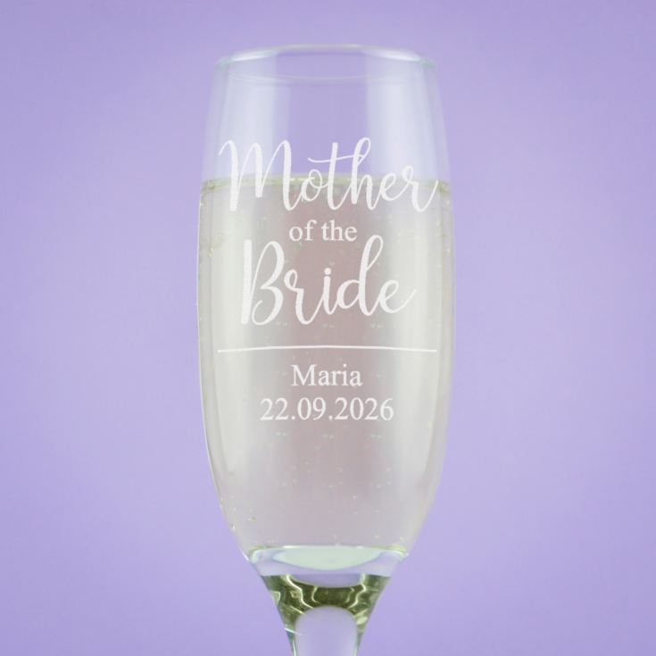 The glass features a stunning font engraving the words ‘Mother of the Bride’, with the recipient’s name and the date of the special wedding day.