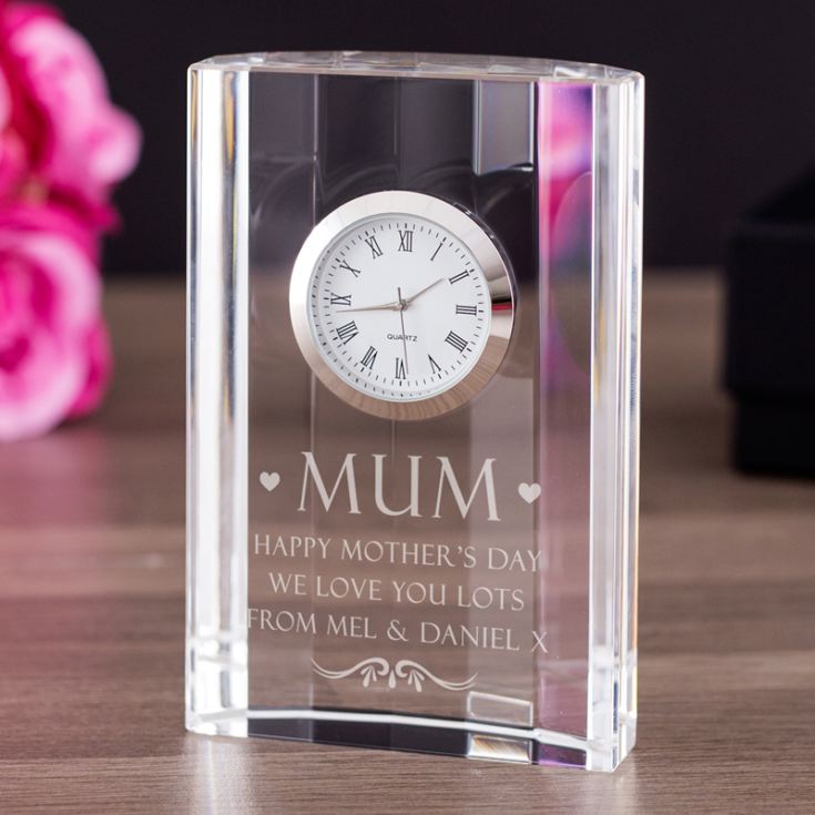 The stunning bevelled Personalised Mum Crystal Mantel Clock is handcrafted out of perfectly clear optical crystal. The front of the clock features the word Mum with a little heart sitting either side. At the bottom of the clock there is a small swirl embellishment that finishes this already wonderful item beautifully.