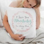 The cushions design is a pretty floral wreath with the words 'No1 Mummy' inside. It can be personalised with a simple three line message. Your message is contained within the wreath too. The text is in a pretty grey and pink colour.