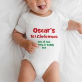 The baby grow is available in 4 different sizes to fit a baby from new born up to 30 months old. It’s personalised with the name of the baby which is printed across the bottom of the baby grow.