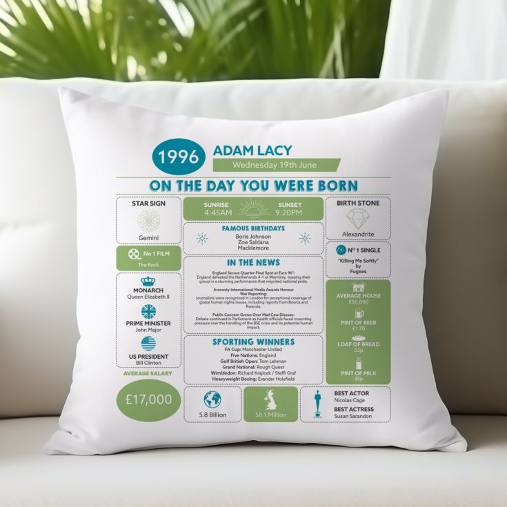 Turning 30 just got a lot more memorable! This Personalised 'The Day You Were Born' 30th Birthday Cushion is a comfy, quirky keepsake that takes them on a trip down memory lane. Brimming with fascinating facts, headlines and pop culture gems from their exact birth date, it’s the perfect gift for celebrating the big 3-0 with a personal touch.