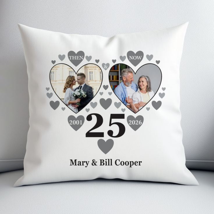The pictures will be printed inside the large hearts with the "then" photo being on the left and the "now" photo on the right. With a mass of scattered silvery grey hearts the cushion also features the number 25, with the year of the wedding printed in a heart to the left and the year of the anniversary in the heart to the right. Just add their names at the bottom of the cushion and you can present this delightful personalised gift to them on their anniversary.