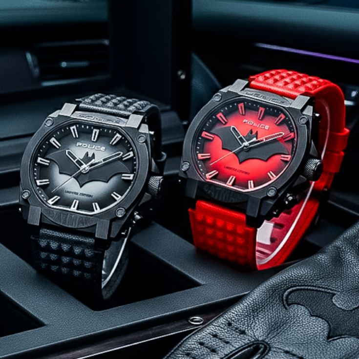 Each limited edition model features a semi-transparent charcoal dial emblazoned with the iconic Bat symbol, brought to life by a green backlight at the press of a button. The black IP-plated case (45mm) proudly displays both the Police and Batman emblems, making it as much a collector’s item as a watch. Choose between the stealthy black leather strap or the bold pyramid-textured red strap — both crafted for comfort and fearless style.