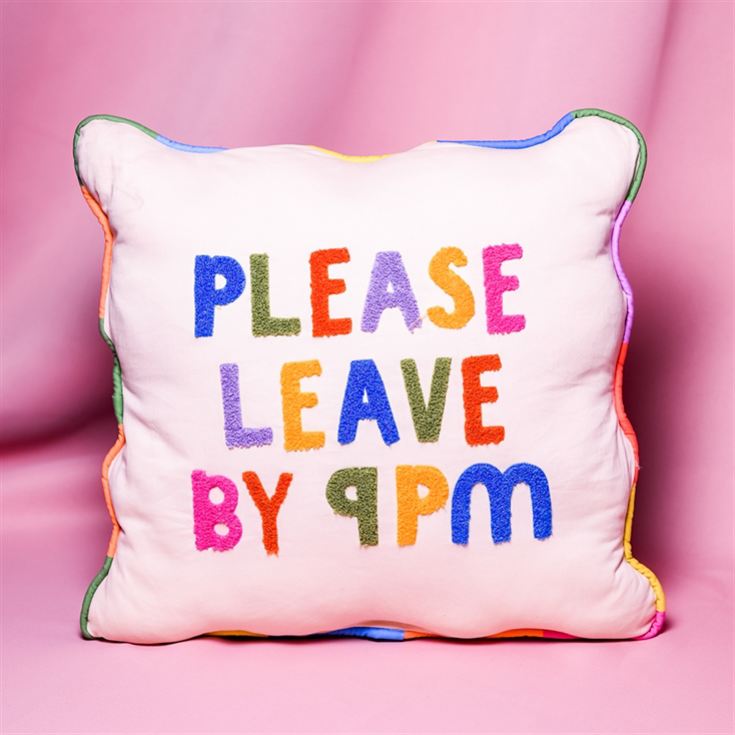 Its cheeky "Please Leave By 9" message delivers humour alongside comfort, making it a talking point in any space. Crafted from soft, durable fabric with vivid stitching, it’s a stylish accessory that combines practical use with personality. Perfect for housewarmings, birthdays, or as a little treat for someone who enjoys entertaining, this cushion effortlessly blends fun and function, giving guests a gentle nudge to know when it’s time to call it a night.