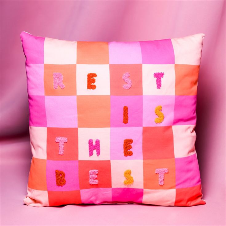 Inject a spark of colour and a cheerful reminder to unwind with the "Rest Is The Best" Raspberry Blossom Cushion.