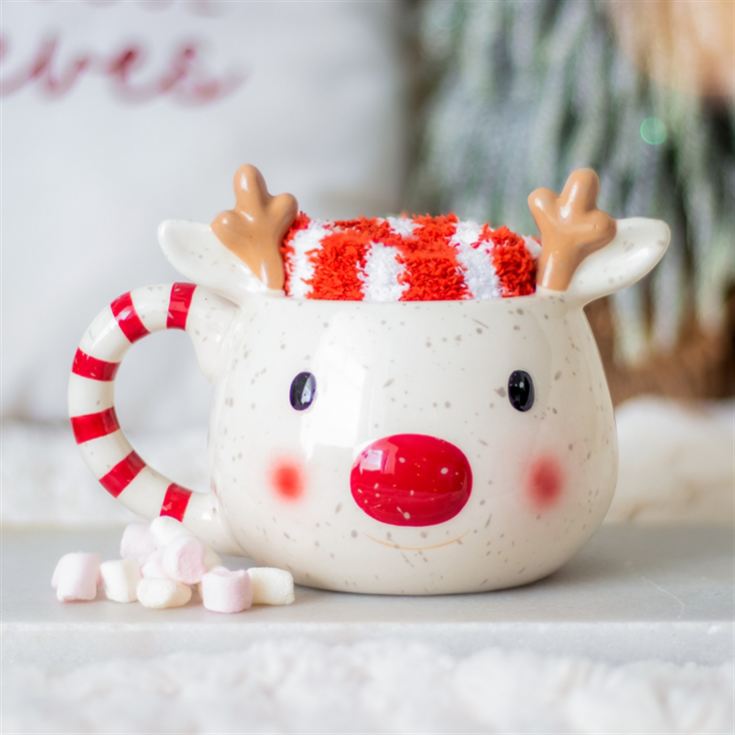 Add some festive cheer to chilly mornings with the Rudolph Reindeer Mug and Socks Set! This adorable, red-nosed reindeer mug holds 400ml of your favourite hot drink, while the matching striped fluffy socks keep toes snug and toasty.