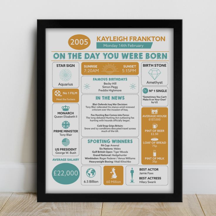 This fantastic keepsake 21st Birthday The Day You Were Born Chart is a personal history containing facts about the day you were born 21 years ago.