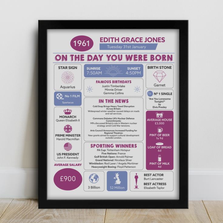 This fantastic keepsake The Day You Were Born Chart is a personal history containing facts about the day you were born 65 years ago.