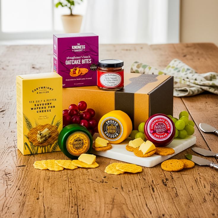 The Three Cheese Hamper is a deliciously indulgent choice for any foodie celebration. Packed with a trio of award-winning Mouse House Cheddars; Caramelised Onion, Smoked and Vintage, it delivers a bold, savoury journey with every bite.