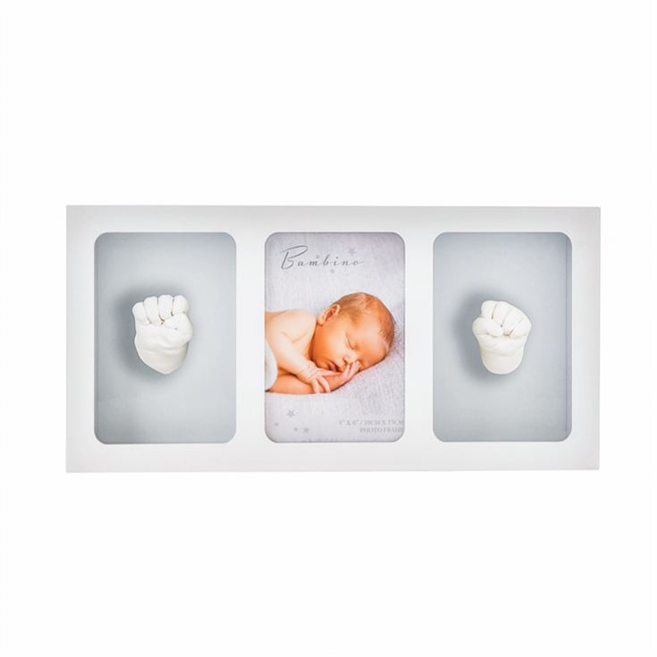 Capture your little one’s earliest moments in a truly unique way with the White Triple Photo Frame & Casting Kit. This clever frame lets you display a treasured baby photo alongside two 3D casts of tiny hands or feet, creating a keepsake that will be cherished for years.