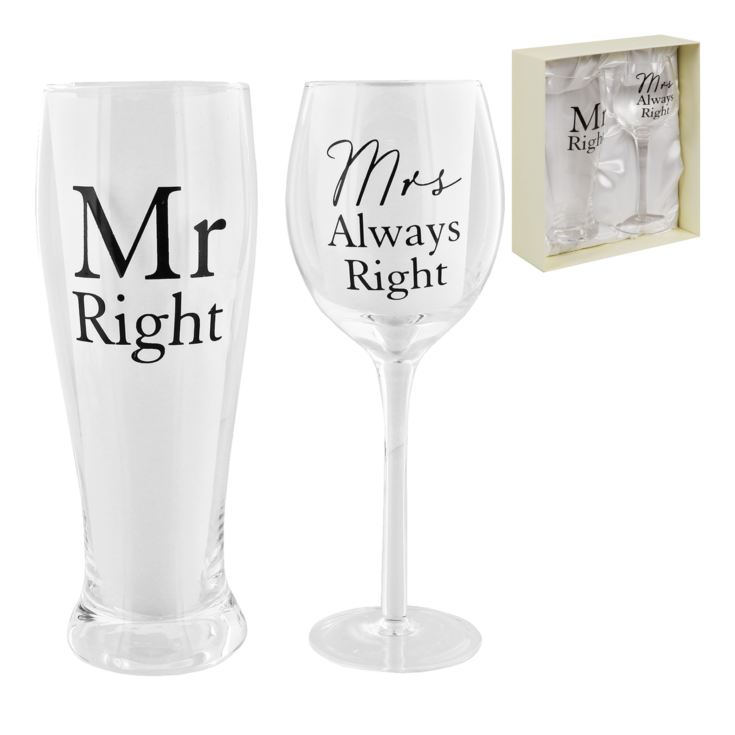 A luxury AMORE BY JULIANA® his and hers wine and pint glass set. The glasses feature black 'Mr Right' and 'Mrs Always Right' titling. Complete with satin lined branded gift box.