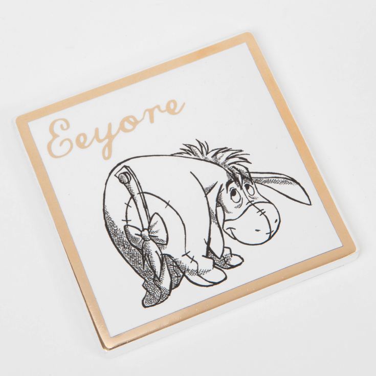 A beautiful luxury white ceramic coaster with gilt edge and pencil illustration Eeyore design. From Disney Classic Collectables - luxurious collectable gifts for the enduring Disney fan.